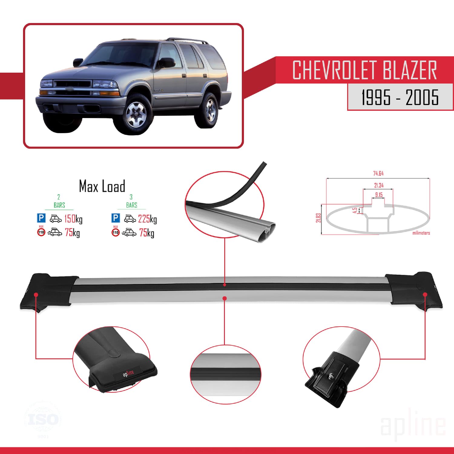 Compatible with Chevrolet Blazer 1995-2005 Fly Model Car Roof Rack Cross Bar Grey Aluminium 2 Bars