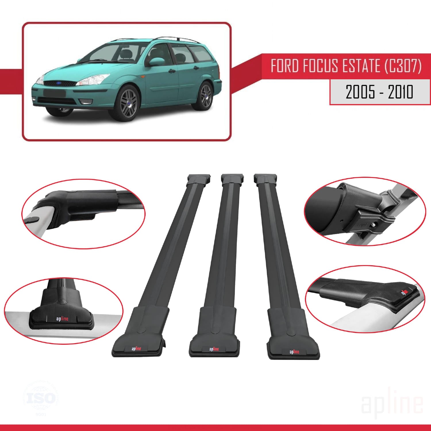 Compatible with Ford Focus 2 (C307) SW 2005-2010 FLY Model Car Roof Rack Cross Bar Black Aluminium 3 Bars