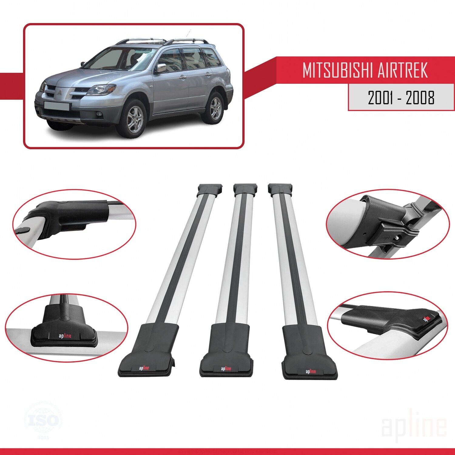 Compatible with Mitsubishi Airtrek 2001-2008 FLY Model Car Roof Rack Cross Bar Grey Aluminium 3 Bars