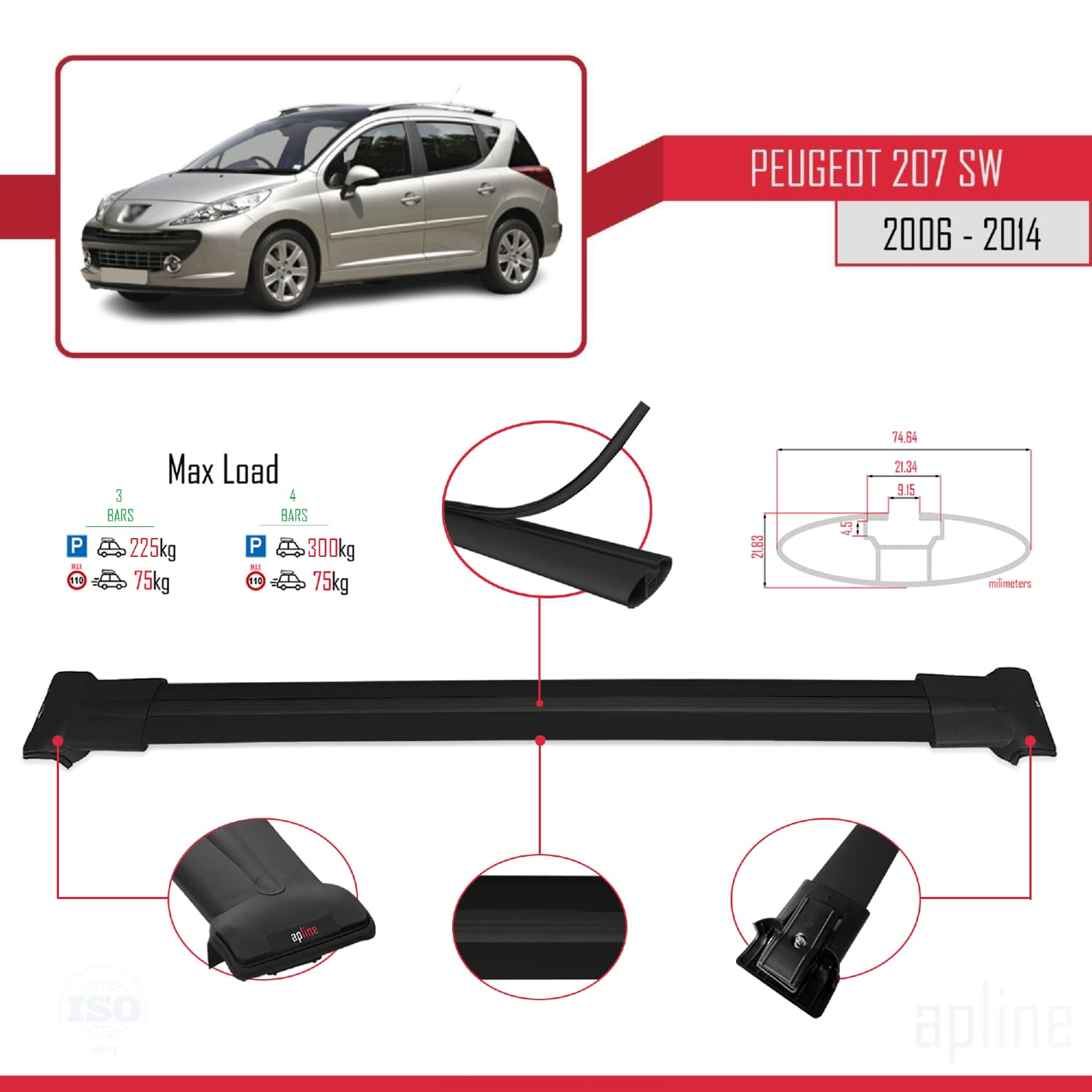 Compatible with Peugeot 207 SW 2006-2014 FLY Model Car Roof Rack Cross Bar Black Aluminium 3 Bars