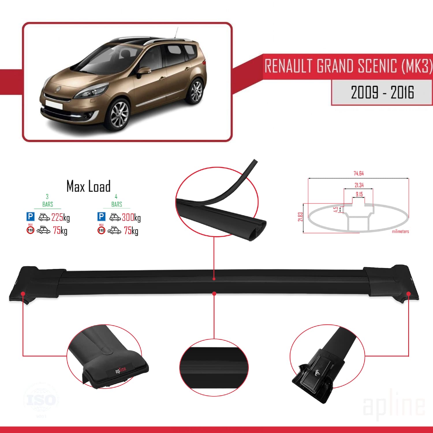 Compatible with Renault Grand Scenic 3 2009-2016 FLY Model Car Roof Rack Cross Bar Black Aluminium 3 Bars