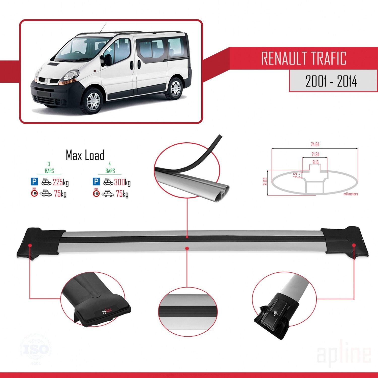 Compatible with Renault Trafic 2 (X83) 2001-2014 FLY Model Car Roof Rack Cross Bar Grey Aluminium 3 Bars