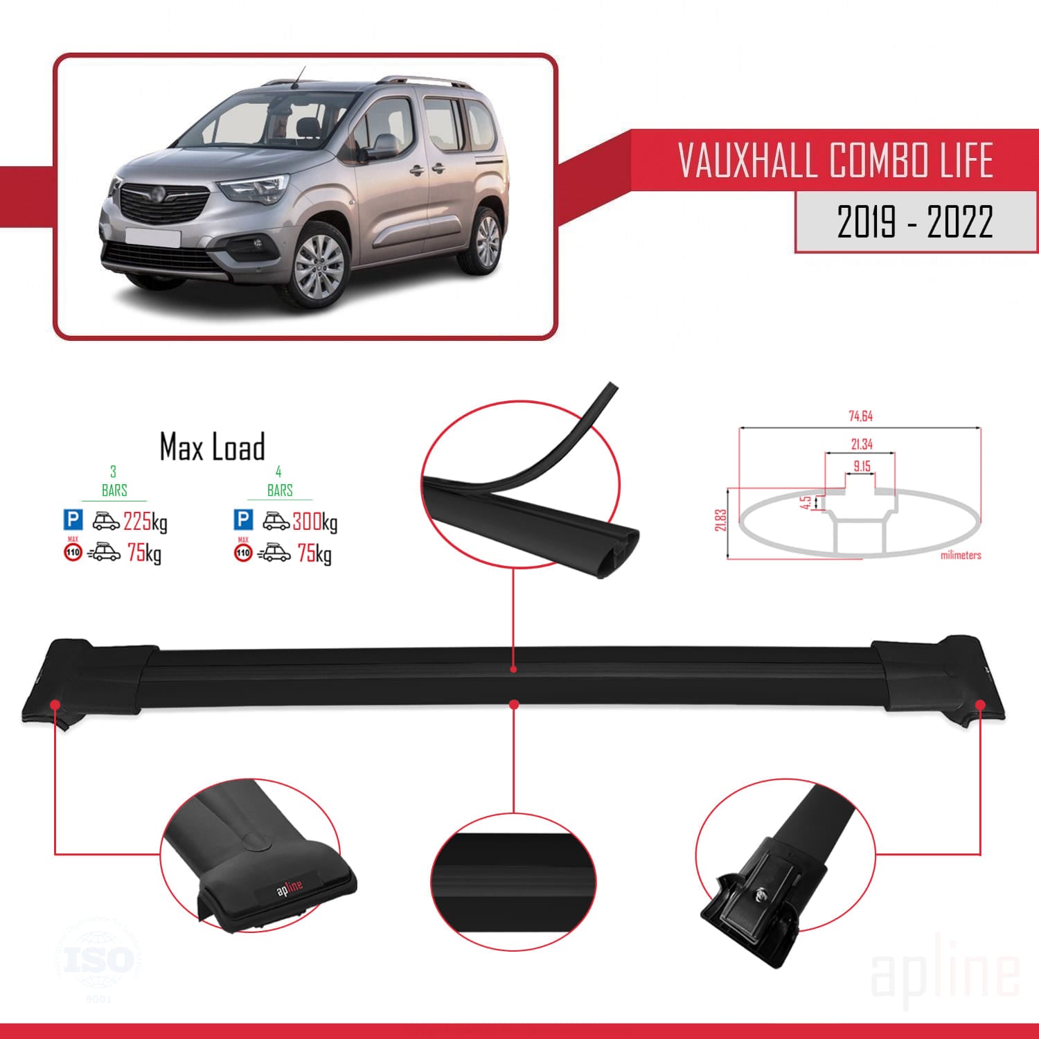 Compatible with Vauxhall Combo E Life 2019-2022 FLY Model Car Roof Rack Cross Bar Black Aluminium 3 Bars
